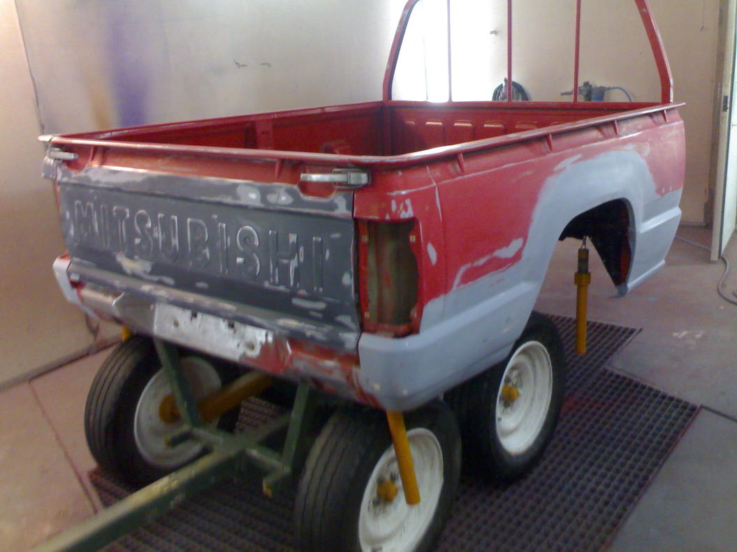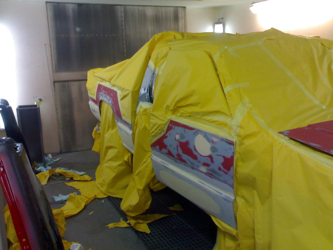 Lava maalaamossa odottamassa peittelyä ja putsausta. Mönkkärin rankakärry osoittautui oivaksi maalaustelineeksi. Sopivalla korkeudella ja helppo siirtää