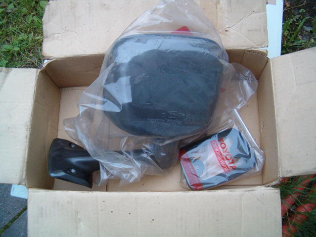 Paketissa oleva (paketti jo hieman elämää nähnyt) uusi alkuperäinen Toyota sivupeili.