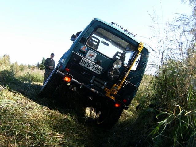 Nyt täs vaihees vuotta meilllä täällä Aurinkoisessa Tylylässä ei ole paljonkaan vettä sadellu eli ei kovinkaan märkää.Innolla odotan että satelis niin pääsis ruovittelee spoorissa urakalla.Toistaseksi taitavasti ajellen reitin pääsee ajaen läpi,ainakin lukottomalla vakio Uazilla, jota tosin jo Ladoga reissulla vertailtiin laitettujen lukollisten Toyboi autojen kulkuihin ja ...Vielä reitti menee ajaen läpi jopa rämeellä, jossa monen monta reittivaihtoehtoa mutta pellolta sisään yhdest kohdasta ja ulos yhdestä,joka taas tekee ajamisesta ja reitin valinnasta haasteellisen.Yhdistelmänä Uaz ja Venäjän vampperi pelaa hyvin,tietenkään en pahimmista paikoista ole ajanu,ne on selkeästi tehokkaamman ja leveämpi pyöräisen hommia.Maastotuntemukseni ja mikäli esim Jaren tai kenen hyvänsä kokeneen kuskin ajotaitoa arvioiden niin on mahdollista ajaa ilman vinssausta,aina on kuitenkin se jossittelun paikka,esim se kivi joka jää kiinni välipalkkiin tms.Lippusiimoin rajailemme ajouraa ja jokapaikassa on leveyttä joko ohittaa tai kiertää,kalliolta alasajossakin jos hirvittää tai reitti tukossa voi kiertää mutta se on hitaampi vaihtoehto.Ylöspäinkin pääsee ajaen kun vain sopivimman reitin katsoo,siinäkin voi olla että teemme vielä kierron joka taas vie aikaa enempi kuin ns suora ylitys...Eli jos puhuva kone ja toimivat renkaat niin ehkei vinssausta tarvita,Toki sääukon hommat huomioiden.!