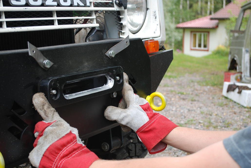 Puskuri ja S-logot. Juusolla on aikomus laittaa valot puskurin sisään. Sitten kyllä logot näkyvät. Vinssi Eilen saatiin asennettua ja koekäyttöön mittari mistä näkee vinssin ottaman virran, akkujännitteen ja vinssin moottorin lämmön. Kunnon vetoja ei ole päästy kokeilemaan, mutta ns normaali veto missä suska tulee nahkoineen narun perässä on noin 70A. Tästä asiasta kerrotaan lisää kunhan on päästy oikein vetelemään. t.Juha |
