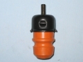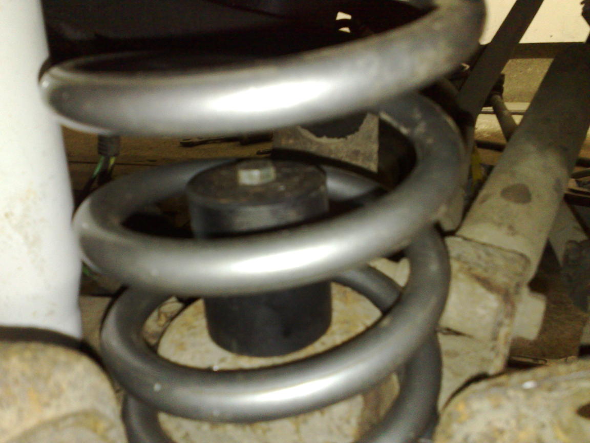 Toisekseen, etupäässä jouston rajoitus kannattaa hoitaa kahdesta päästä - toisin sanoen jousilautaseen kans tavaraa. Yläpään rajoitinkumin voi pitää vaikka ihan orkkismittaisena. Sopivia palikoita tuohon puuhaan on joko halkaisijaltaan (muistaakseni) ~75mm muovitanko johon poraa reiän keskelle ja pultilla jousilautasen läpi kiinni. Toinen (halvempi) vaihtoehto on kasata sopiva määrä kiekkoja sinne jousilautaseen ja pultilla kiinni, ovat sopivasti 25mm:n paksuisia niin on riittävän tarkkaa puuhaa.
