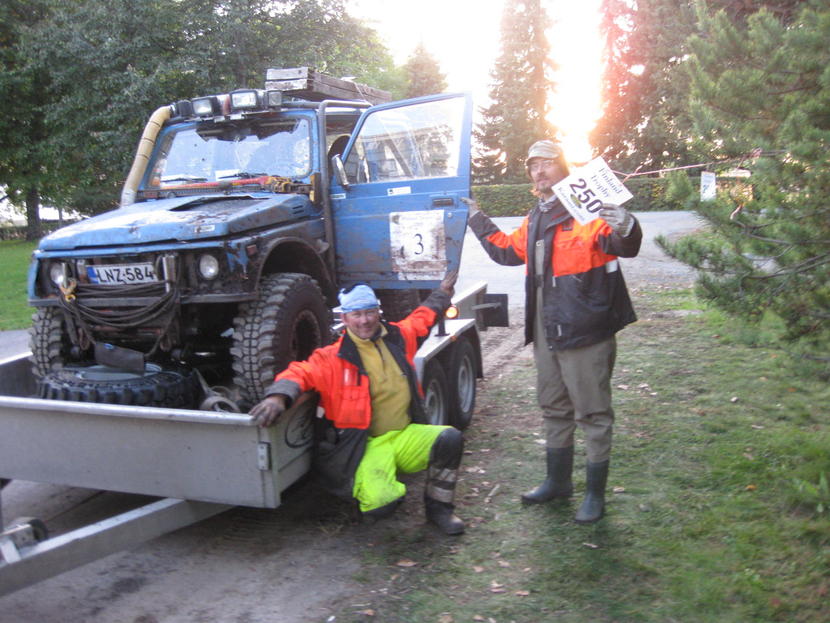 kisan alussa näytti jo huonolta kun joka paikkaan mihin mentiin juoduttiin jonottamaan aamu yöstä menetettiin rengas (pyöränpultit poikki) onneksi pienessä vaudissa ja kovallamaalla onnistuttiin vaihtamaan pultit ja ajettiin varmaan kilometri ja uudestaan poikki (ei enää niin kovalla maalla) tämäkin onnistuttiin korjaamaan metsässä , mutta käytiin tekemässä varma korjaus kisa keskuksessa. tässä vaiheessa oltiin varmoja ettei lähellekään kärkeä ole mahdollisuutta korjauksiin mennyt yli 4h lähettiin kuitenkin ajelemaan vielä kun aikaa oli reilusti. sitten siellä uimarasti alueella ( haettiin muuten kaikki 3 kosteaa ) meni vetari poikki kolme tuntia ennen ajan loppumista eikä ruvettu enää vaihtaa kun ajateltiin ettei olla kärkikahinoissa mukana, mikä oli virhe olettamus 2 sijaan 16p 1 vähän päälle 200 T. TEAM OFFROADTARVIKE |