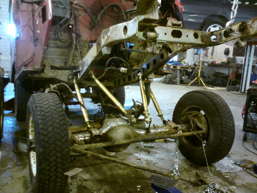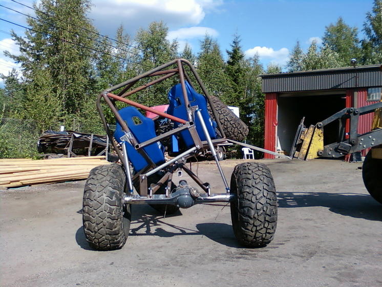 Noniin,nyt loytyy akselista liikettä.Volvon jouset on vähän turhankin jämäkät,nostin perää 15cm tunkilla niin auton takapää nousi jo,niillä jousilla takapää jää todella korkeelle ja kardaanin kulma olis aika jyrkkä,pitää kokeilla vähän ohuempilankaisia jousia tai sitten tuon jouset lattian läpi sisäpuolelle.
