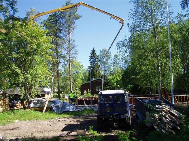 Nyt on tehty jälkivaluja. Muottina on ollut sinistä styrofoamia urtsilla liimattuna. Aika tarkasti pitää muotti tiivistää, kun juotosbetoni löytää kyllä pienetkin virheet muotista. Tulee jämpti pohja pilarille, kun täyttää välin juotosbetonilla, joka turpoaa aavistuksen eikä kutistu, kuten normibetoni.