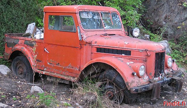 Tää oli puoliksi metsälöytö. Hytti + runko + etuakseli ja jakis oli lojunut 30v ojan reunalla, loput osat oli sisällä vanhassa autotallissa. Kuvassa osat vaan kasailtu näön vuoksi yhteen.