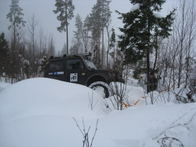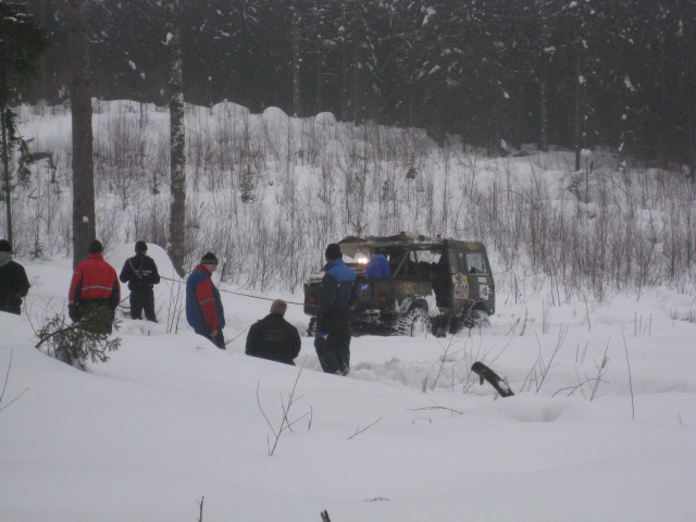 Alkuun auto ei liikkunut käytännössä mihinkään ilman vinssiä. Otettiin sitten renkaista paineet alas, eteen jätettiin 0,3 bar ja taakse 0,1 bar ja alkoi pitoja löytymään mukavasti. Woima moottoriin pitää asentaa kiireesti jokin puhallin kupeeseen kun tuntu välillä puhti loppuvan umpisessa ERITTÄIN HYVIN järjestetty kilpailu. KIITOS !