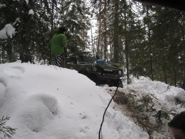Haukku Racing Peruuttamalla "luolaan" Pieni droppi Jonka vasemmalla puolella oli "ihan kiva" pudotus talviliukkailla. Ei tainnut kukaan osua sinne? Poies.. LaaLaa näyttää sormella menosuunnan, tästä ylöspäin. Luolassa rupes olee ahdasta kun sinne puskee lisää autoja. Mut kyl sinne jotenkin kaks pätkä Patrollia portaaliakseleineen mahtui. |