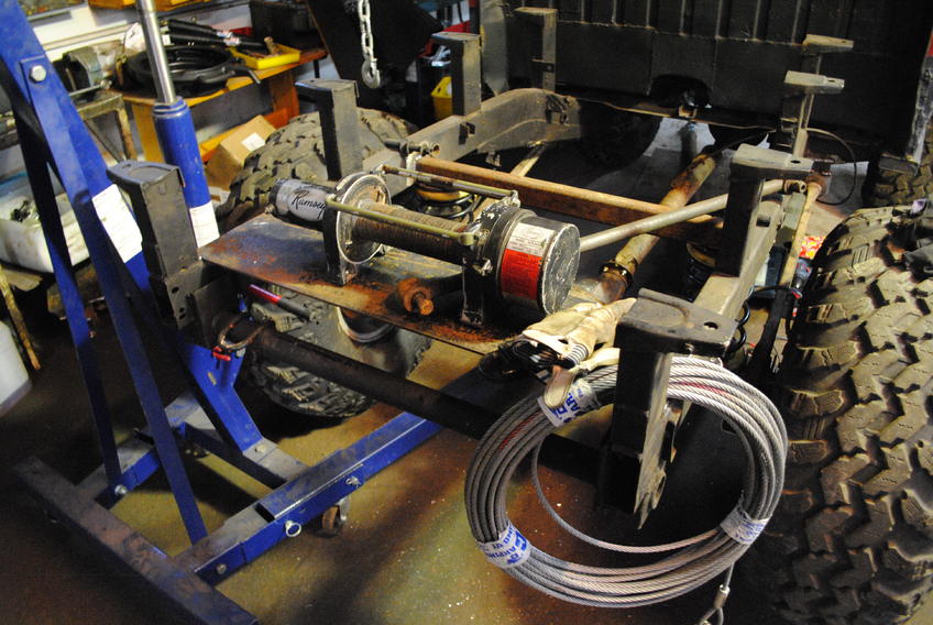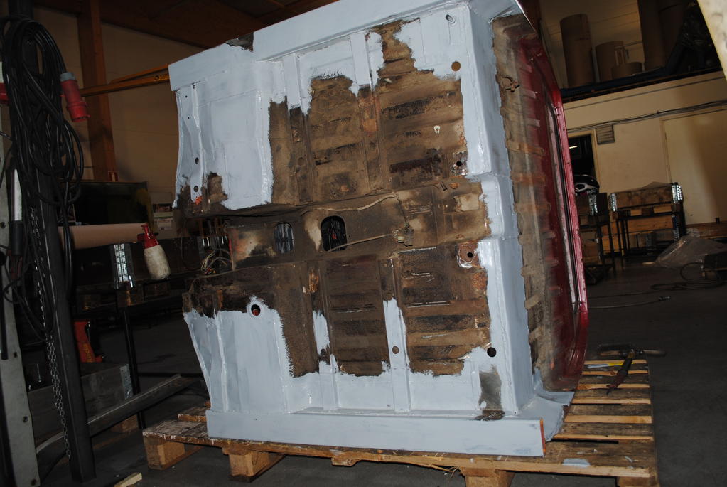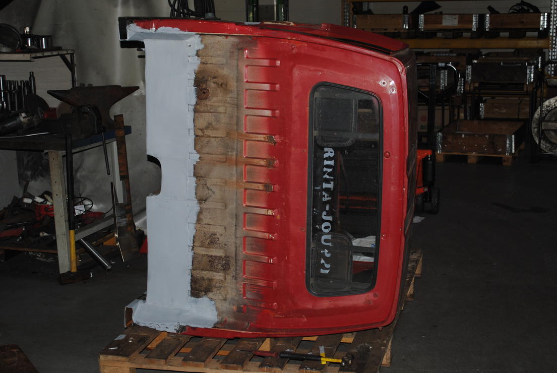 Hytti paikallaan, keulapala ja lava vielä hitsaamatta, takana tässä vielä lehtijouset, edestä puuttuu vielä panhard, iskarit ja pohjaanlyöntikumit, iskareiksi sierran takakaasut, iskua 25cm...