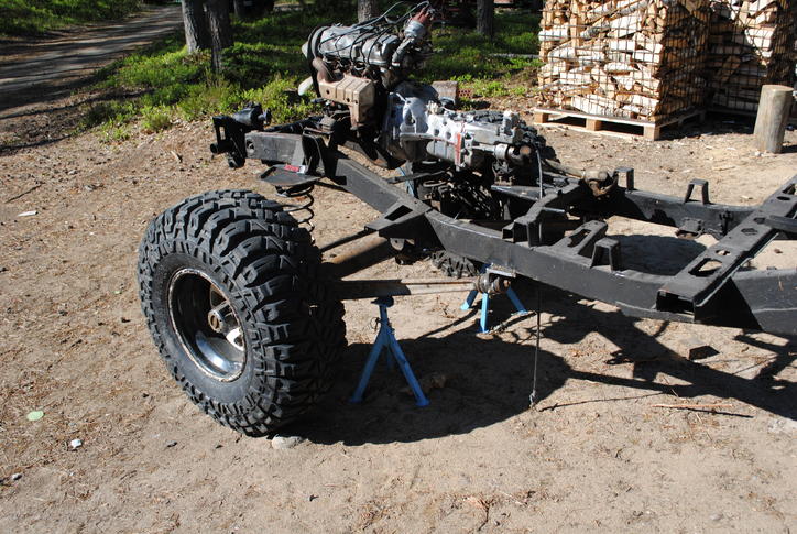 Volvon laatikko (en muista ykkösen välitystä), 410 jakis tossun välityksellä ja akseleissa 4.6 välitykset ja renkaat 35 muzzillat.
