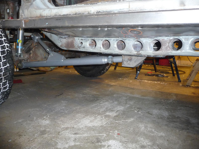 Etuakselia mallailtu paikalleen. Tukivarsien korin puoleiset korvakkeet valmiina. Täytyy suunnitella vaihteistonkannatinpalkista tuki noille tukivarrenkiinnikkeille. Uudet iskarit ei saali niin paljon sisäänjoustoa kuin entiset, mutta saattaa olla että joutuu muutenkin rajoittamaan kun rengaskokokin kasvaa parilla tuumalla. Nykyiset iskarit pisimmillään 80cm ja lyhimmillään 52cm, ulosjoustolle jää liikevaraa 42cm. High steer ohjausvarret sopii aika hyvin paikalleen mitä nyt simpukalta lähtevä varsi on hieman vinossa auton poikittaissuuntaan nähden. Kannattaisikohan vaihtaa pitman arm sellaiseen malliin joka ei pudota sitä noin alas kuin kuvissa ja siirtäisi samalla vartta taaksepäin? Oliko se niin että panhard olisi hyvä olla tuon simpukalta lähtevän varren kanssa samassa kulmassa? Kallistuksenvakaaja ei meinaa sopia millään tähän pakettiin, mutta leimasetä sen kuitenkin paikalleen vaatii