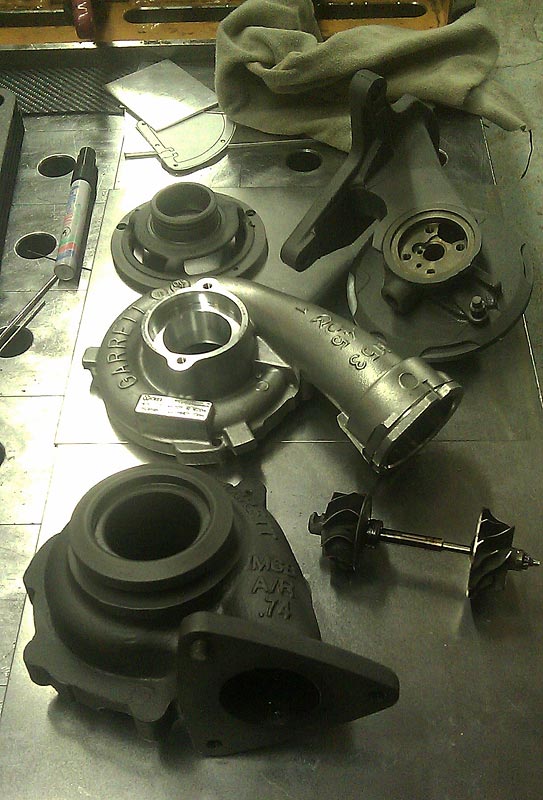 Eilen meni puol iltaa kaverin kellarissa sen turbokokoelmaa läpikäydessä. Neljä ahdinta todettiin paskoiks ja ne meni romukeräykseen. Mersun tuplaturbosarja-ahdinhässäkkä todettiin soivaks peliks(tosin se on vaihdettu koska ahdin äänti) ja ei sit kaveri suostunutkaan sitä mulle myymään. Lisäks olin jo valmis lähtee tekee 2x 1,6TDI VNT tuplaturboa, mut todettiin toteutus puutteellisten tallitilojen takia liian hankalaks. Haalin sit itselleni VW Transportterista löytyvän 2,5TDI(130hv) koneen ahtimen itselleni. Eli siis Garrettin GTB1749V VNT-ahdin kyseessä. Kyseisestä ahtimesta on jotain hienon hienoa hilua tullut läpi, josta pienen pientä jälkeä pakoturbiinissa ja VNT-siivissä, muttei mitään vakavaa. Joku asentajatohlo onnistunut katkomaan pultin pakolaippaan ja kaveritohlo meni katkoo yhden pienen VNT:n ruuvin ahtimen runkoon. Todennäköisesti on aivan liian pieni tuohon koneeseen, mutta tuskin laitan tuosta isompaa ellei ahdin ala ahdistamaan matkavauhdissa(85-90km/h) liikaa=lämmöt nousee. Herääpähän todennäköisesti ennen kuin jalka varsinaisesti ehtii kaasuun koskemaan. 617 turbon vakioahdin on kuitenkin tuosta pienempää kaliberia ettei nyt ihan tajuttomasti voi ahdistaa vaikkei tällä mihinkään ST-tehoihin päästäkkään. Tehotavoite 150hv ja vitusti alavääntöä(eli siis mukava käyttöpeli ja todennäköisesti metsässäkään tuosta alaväännöstä ei ainakaan haittaa ole)... =) Tänään tuli viitisen tuntia puuhasteltua turbon parissa koululla(josta tosin varmaan 2h puhuin paskaa vanhojen formulatiimikavereiden kanssa =). Rautaosat puhaltelin hiekalla puhtaaks purkamisen jälkeen ja alumiinille näytin messinkinharjaa(kiillottaa mukavasti karheen valunkin). Lisäks näytin rälläkkää tolle alkuperäiselle öljyjalalle(kiinnitty koneen kylkeen). Paljastu sellainen ongelma, että öljyn sisääntulokanava on D-muotoinen ja aivan reunassa. Pitänee täs joku päivä plaanata toi suoraks ja hieman jyrsiä öljykavanaa keskemmälle. Sit vaan 5-10mm plootua(riippuu mitä löytyy hyllystä) puikolla kiinni ahtimen runkoon. Lopuks uus reikä öljyn sisääntulolle. Onneks oon vielä koulussa niin on fasiliteetit harrastaa... =) |