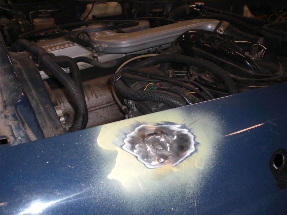 Pakko oli happoa roiskia päälle, ettei ruostu ihan heti, olin nimittäin ton toisen sisälokarin puhaltanu jo kesäkuussa...ei se tallikaan ihan kuiva paikka ole näköjään. Ja pari reikäähän sieltä löyty ruosteen alta, sekä etukaarista, että sisäkaarista.