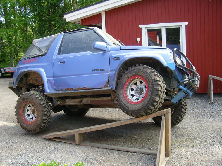 Suzuki Vitara 1,6 16V turbo muutettu huutokauppa 700 €Myyty Huutokauppa alkaa nyt.Aloitushinta 700€ ilman pyöriä. Huuto päättyy viimeistään 26.6.2011 klo 20:00 voi loppua ennemminkin jos siltä tuntuu. Korotukset 50€. Kaikki iskarit uudet. Panssarit edessä ja keskellä. Tankkia nostettu ja panssaroitu. Koneremontti tehty ja turbotettu. Alkuperäinen pakosarja mukaan. Uusi kytkinlevy asennettu. Korinkorotus 50 mm ja 235/75R15 renkaat otteessa. Ei ole vähäpäästöinen merkintää otteessa. ECU huollatettu alan liikkeessä. Lisäksi (30.5.2011.) varapyörän sekä pienriistapuskurin, pari ramppia, puunsuojaliinan, metallisentyökalupakin. MB korottavat jouset eteen. Takana korotus Audi 90 jousilla. Osta heti hinta 1200€ ilman pyöriä, Kuljetusvelvollisuus ostajalla. Aikataulu sovitaan erikseen. Eurassa. Myyty