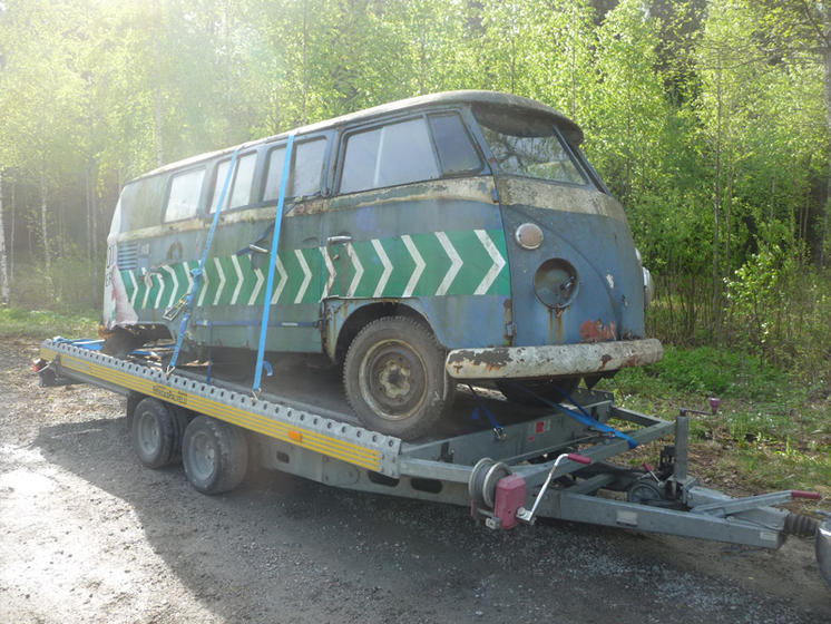 Sisua45:n mökkivarasto käyty tänään noutamassa varaosiksi Luumäelle. Kerrankin reissu meni ihan putkeen eli ei kulunut koko päivää, ei saatu sakkoja, mitään ei hajonnut matkalla ja kohde oli odotusten mukainen. Pirusti on hyttysiä, ja isoja sellaisia, tuolla päin Suomea. päätettiin heti paikalle saavuttua kahdeksalta, että täällä ei kauan vanhennuta noiden verenimijöiden takia. Pakuun etuakselille renkaat joissa ilmaa sisällä, yhden puun katto ja sitten vetoa siviilimallisella KingCabilla, tais matkaa tielle olla jotain pari sataa metriä. Tasan tunti paikalle saapumisesta sai Volkkariharrastaja vaihtaa kuivan paidan päällensä "auton" ollessa trailerilla kiinni sidottuna. Kaikki ovet ja luukut joutui köyttelemään liinoilla kiinni, siksi noin omituisen näköinen kuorman sidonta. Kartturini Pasi kiittää autokauppiasta vielä tätäkin kautta.