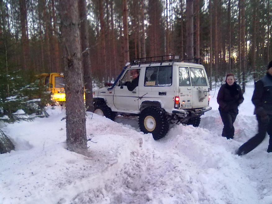 Käytiin taas sunnuntaina vähän ajelemassa. Mukavasti oli lumet jo sulanu, paitsi mutaspoorin keskitöntäre oli vielä jäässä mikä hidasti hieman etenemistä. Hiluxista ja GR:stä lähti kumi vanteelta lähes samaan aikaan ja Bertasta hävis takaveto kun jakolaatikko hajos. Ei kannatas hinata ketjujen kanssa. Hiluxin vinssissä oli joustavaa kiipeilynarua. Mukava kuminauhaefecti vinssatessa.