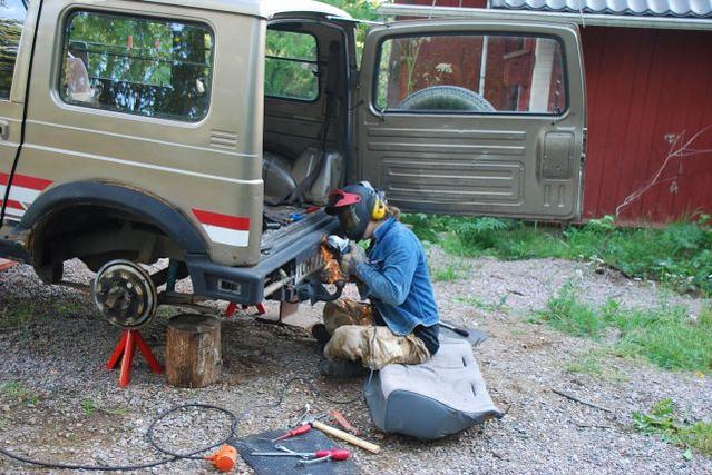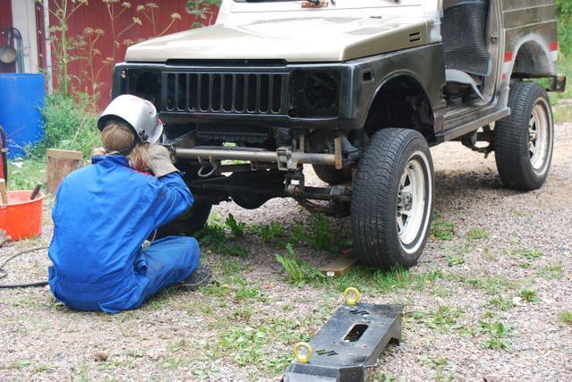 Hitsaamisen lisäksi Make opetteli auton maalausta. Välineet ja olosuhteet eiv vaan oleet kovin kummoiset. Spray kannulla ja taivasalla. "Kolvikalle" laittoi vielä autoon valot. Vilkut on tehty siitä materiaalista mitä sattui sunnuntaina olemaan saatavilla eli Samurain omat vilkut kiinitettiin puskurin päälle. Saas nähdä kuinka pysyvä väliaikaisratkaisu tämäkin taas on. |