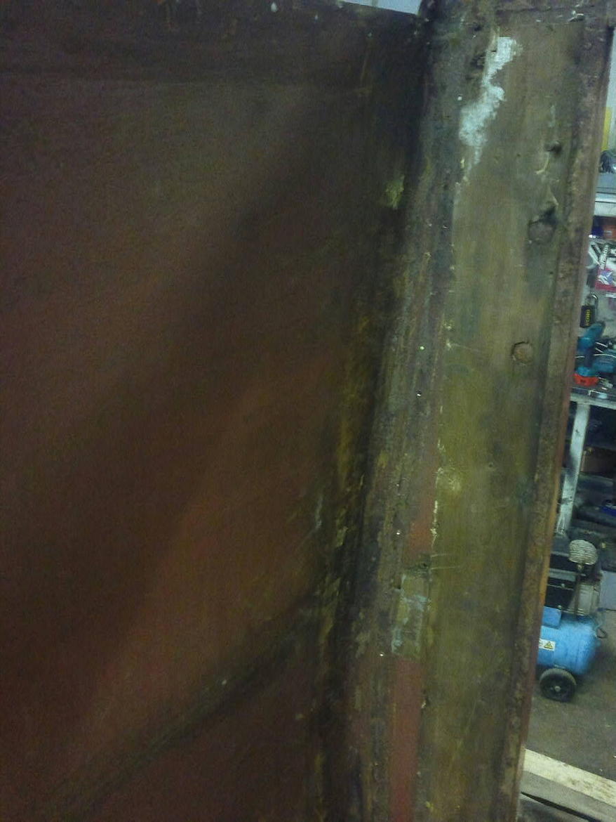 Pikkasen oli aika & poika päässy nakertaan takahelmaa. Osasyynä saattoi olla toi vuodelta -62 oleva muotopuu siellä sisällä... ![]() Takakulmapalkki oli päässy niin happamaksi, että se piti poistaa vallan... Aikas suunnittelu korvaavasta osasta. Kulmapalkki pois, niin ilmastointi oli taattu. Pikkusen oli jännityksiä kun kuulu vaan BOJOJOINGGGGG kun viiminen puupala irtos. Tämmönen kolmeen suuntaan viistetty kiilapala piti tehä sinne kulmaan. Ja täämmönen siitä nyssi tuli. Aikas palapeliä ja suunnittelua. Josko huomenna sit pääsis tekeen runkokehikkoo jo.