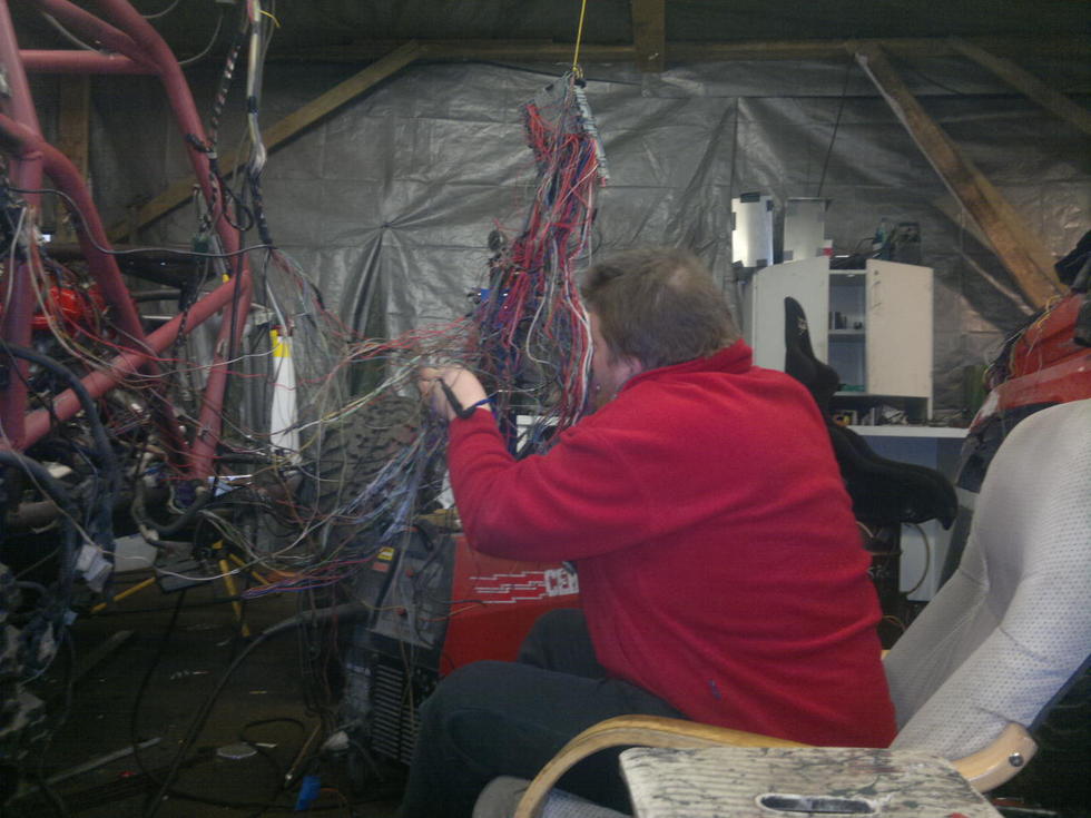 Ja sitten Sähköseppä Teemu kävi sen sähkötuheron kimppuun ja poistuihan sieltä jo aika kasa "kait turhia" johtoja ja muutama oho ei tota, se epämääränen kasa on niit "turhii" kai. Itse sain hydrauliikkaletkut vedettyy suurinpiirtein sinne missä niiren paikka pitäis ollakki nyt viel pätkii ne oikean pituisiksi, samalla lauhruttajat haki paikkansa takaa, tankkien suunnittelu jatkuu viäl ja ehkä pääsiäisen jälkeen hitsaukseen.