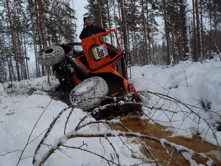Oma kisa ei mennyt ihan putkeen, taka-panhard meni poikki, etuvetari napsahti poikki ja sitten kaadettiin 13-metrinen puu. Korjauksiin meni 4-tuntia ja puusta 130-pistettä sekä 65€ maksua. No aina ei voi voittaa. Sattuiko muuten kukaan löytää ykkös alueelta yhtä PMR puhelinta, meiltä katos semmoinen siinä touhutessa.