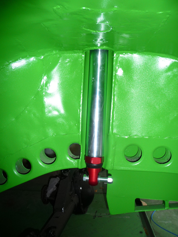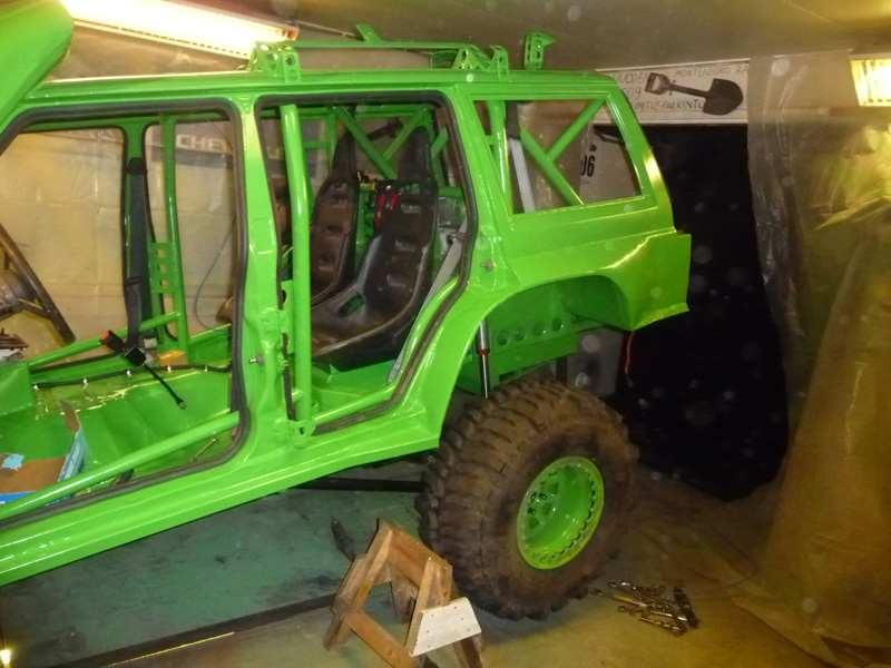 Shrek sai tänä iltana jalat alleen. Muutama juttu alkoi vaivaamaan kun tunkkailtiin joustoja ja pällisteltiin asennustyön tuloksia. Olisko kuitenkin 16" tikut ollut taakse paremmat että saisi ulosjoustoa enemmän, ekassa kuvassa akseli maksimit ulkona. Etupäässä on Rubicon Expressin 5,6" vieterit ja ainakin ilman etupäähän tulevia osia näyttää keula aivan liian korkealta. Kori on saman levyinen kuin edellinen versiokin ja raideleveys 5cm kapeampi, mutta silti pyörät näyttää tulevan hullusti kaarista ulos