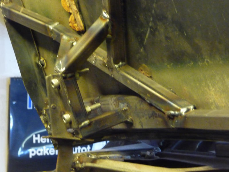 Ajosiltojen "kattotelineet" hitsattu paikoilleen. Puuttuu vielä kiinnitysjärjestelmä, yritän soveltaa samasta palikasta katolle telineen lapiota varten. Konepellissä oli sisäosat todella lahossa kunnossa ja sen vuoksi siihen tehtiin kokonaan uusi runko. Muutaman gramman kevyempikin taisi tulla alkuperäiseen verrattuna. Konepellin saranat joutui siirtämään keskemmälle jotta imuilmaputket mahtui paikalleen. Samalla konepeltiin tehtiin kiinteä korotus takalaitaan irtopalikoiden sijaan. |