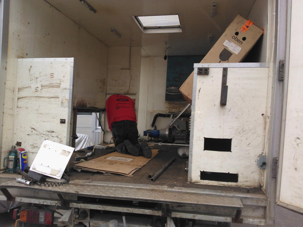 No niin tänään kässäri saatiin toimimaan, ja jarrut noin ehkä... Sitten vielä purettiin yksi jämä pelti osa tuosta korkean oven alta, kun melkein meni jalkakin lattiasta läpi. Harrikin napsi ohimennen jo tukirakenteet uudelle lattialle. Katotaan mitä huomenna.