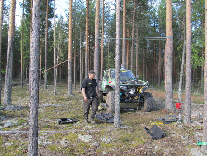 Kiitos kaikille jotka teki reissun mahdolliseksi. Ilman Ossin jeesiä ei auto olisi tullut jotenkin valmiiksi. Kankulle kiitos myös monesta eri jeesistä. Petelle kiitokset La-asennuksista yms. Eezalle kiitos loistavista luukuista jotka kesti kuperkeikan taaksepäin suorin vartaloin ne on ihan kuin uudet. aivan loistavaa materiaalia. Venäjän puolella kiitos Timolle ja heidän huollolle ja Nikolle joka näytti että on sellainen ajomies että pois alta! Ja kiitos Arskalle dumpperista ilman sitä olisi kisa jäänyt ajamatta kokonaan ja tietty Lamppu samille joka sen toi lappeenrannasta meille. reissu oli enemmän huoltoa kuin ajoa,mutta silloin kuin auto toimi, niin eteni hyvin. tuli tehtyä liian isoja muutoksia jotka ei taaskaan valmistunut ajoissa. nyt ei tehdä isoja muutkoksia vaan korjataan nykyiset. kaato oli oma vika kun alkupätkä meni liian hyvin, niin ei tullut vinsssillä varmistettua nousua. onneksi oli kypärä päässä ja vyöt kiinni. Ajamalla päästiin kuitenkin pois metsästä ,kun Ossi kalsarit jalassa tuli ojien yli ja saatiin autokäyntiin. etupää vähän lommolla, ja akseli vino, iskarit säily ehjänä ,tuulilasi tuli sisään joka aiheutti vähän turvotusta vasempaan poskeen. Muuten kärsimys henkistä ! Sitten tulikin vietettyä reipasta leiri elämää ja taka-akseli tuli parsittua kasaan ,mutta ei ollut järkeä lähteä enää viimeiselle pätkälle riskeeraamaan. Venäjä on venäjä Ensivuonna uudestaan ! |