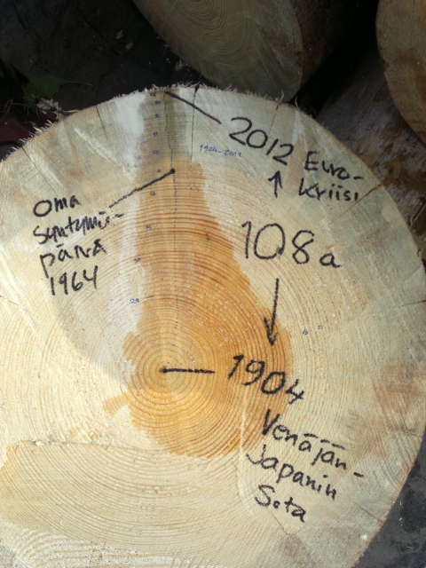 vanhin puu, jonka olen koskaan kaatanut oli nyt siten kuvassa näkyvä 108-vuotias kuusi. Aloitti kasvunsa Venäjän ja Japanin välisen sodan aikana ja päätti päivänsä eurokriisiin. Puu olisi ansainnut paremman lopun. Mutta kuitenkin BIP, Burn in peace.