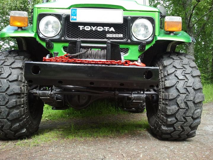 Etupuskuri vuorossa. Hieman vahvistusta ja muotoja alkuperäiseen. Alaosa siis uutta osuutta ja se on tehty neliöpalkista. Hitsattu Maalattuna Edestä Ehkä ihan hieman tuli tuollaista "ARB" muotoa. Puskuri kun on BJ:ssä sen verran kaukana edessä, niin mikään älyttömän massiivinen ja leveä häkkyrä ei mielestäni näytä hyvältä |
