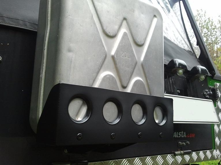 Tein polttoainekannulle hieman korkeammat laidat ja uudella työkalulla reijät koristeeksi Teline maalattuna ja kiinni autossa. Varmistukseksi tulee tietysti vielä kiristysliina |