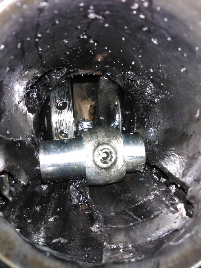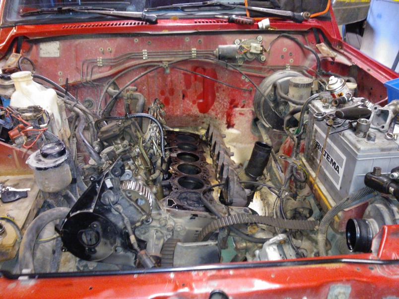 sitten alettiin aukoo konetta ja sieltähän löyty ainoastaan 5 mäntää... yks olikin pieninä palasina öljypohjassa.
