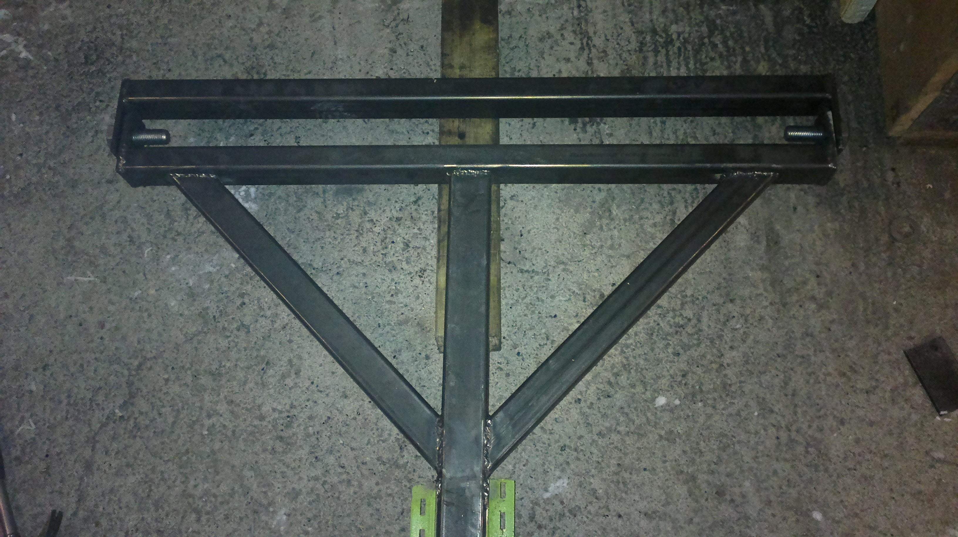 Vahvistin nyt tota runkoa nurkista löytyneellä hyllytolpalla. Se on 40x40x3 T-profiilia. Mielestäni joustaa vieläkin liikaa ylös/alas suunnassa, taidan pistää pohjaankin vielä jotakin ylijäämäkamaa.