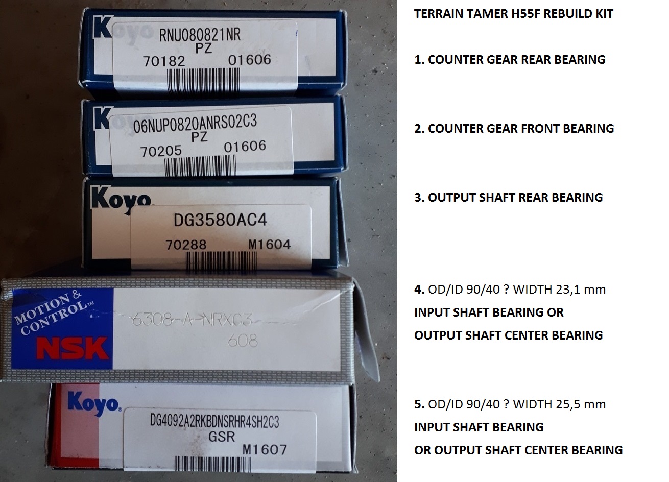 Mites Terrain Tamerin GBK4 rebuild kit -sarjassa menee tuon H55F laatikon laakerit (ei siis jakis mukana). Nuo pienemmät laakerit ovat mielestäni noin kuten olen merkinnyt kuvaan, mutta nuo kaksi suurempaa ei ihan avaudu pelkästään paikalla olleisiin vertaillen. Etenkin tuo laakereiden ulkokoolien leveys 23,1 ja 25,5 ei täsmää paikalla olleisiin, jotka molemmat olivat 23 millisiä. Toisaalta kumpikaan noista Terrain Tamerin sarjassa olleista laakereista ei ole rullalaakeri ja paikallaan olleva INPUT SHAFT BEARING oli rullakaaleri.