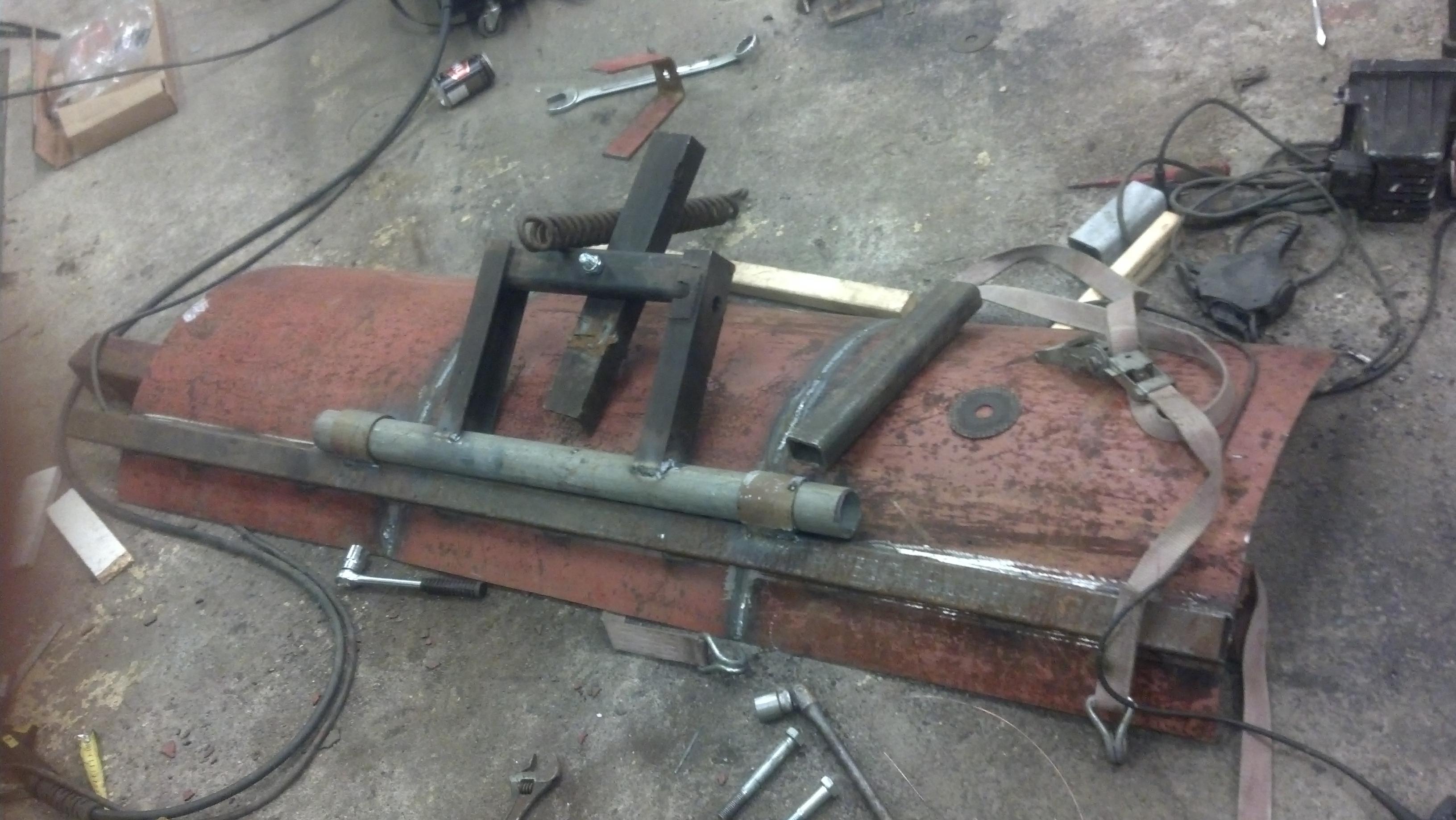 Itse levy tehty 600litran kalvopaisuntasäiliöstä, sivuttaistuenta hoidettu vinssin petiä vasten kuten auran kääntäminen vaakatasoon ylös nostettaessa. Kiinnitys vetokoukkuun ja lukko taipuu alas 2 sokalla. Jonkinlaisia nurkka merkkejä se vielä huutaisi kun nyt ei näe autosta oikein missä se menee ja voishan sitä jonkinlaisen rajakytkimen rakentaa tuohon vinssiin ettei tule nostettua "sulakkeisiin" asti. Maalatakkihan se pitäis... Niin ja tuo jousi pitäisi vaihtaa vähän köykäsempään nyt on niin jäykkä että sama kuin ois kiinteenä. ![]() ![]()