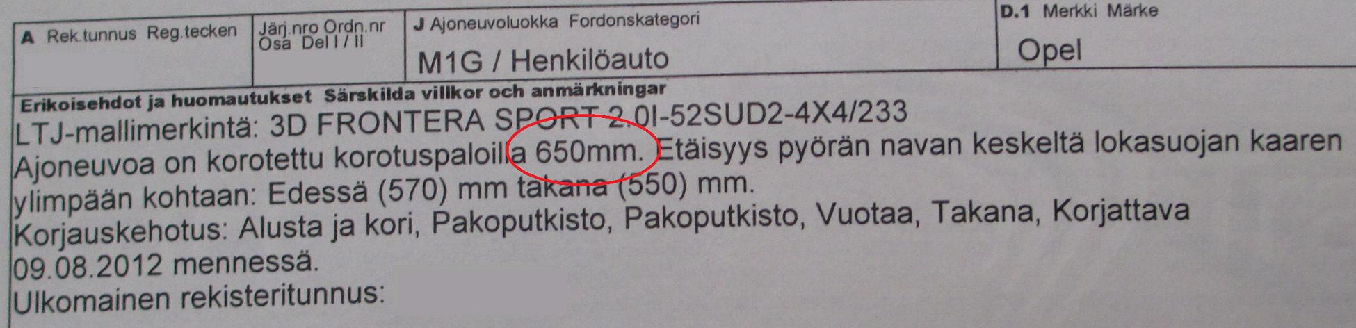 -Korikorotus 65mm -Renkaat 33 x 12,5 x 15 -Etupuskuri nostettu ylös, kuten myös karjapuskuri. -Tankki nostettu ylös. -Takapuskuri tehty ja valot upotettu, valojen väliin paneeli. -Palkkihelmat ja astinlaudat. -Varmasti muutakin, mitä ei suoraan muista. Viimeisessä kuvassa, katsastusmiehen kirjaamassa versiossa, 65mm korin korotus muuttui 650mm korotukseksi. |