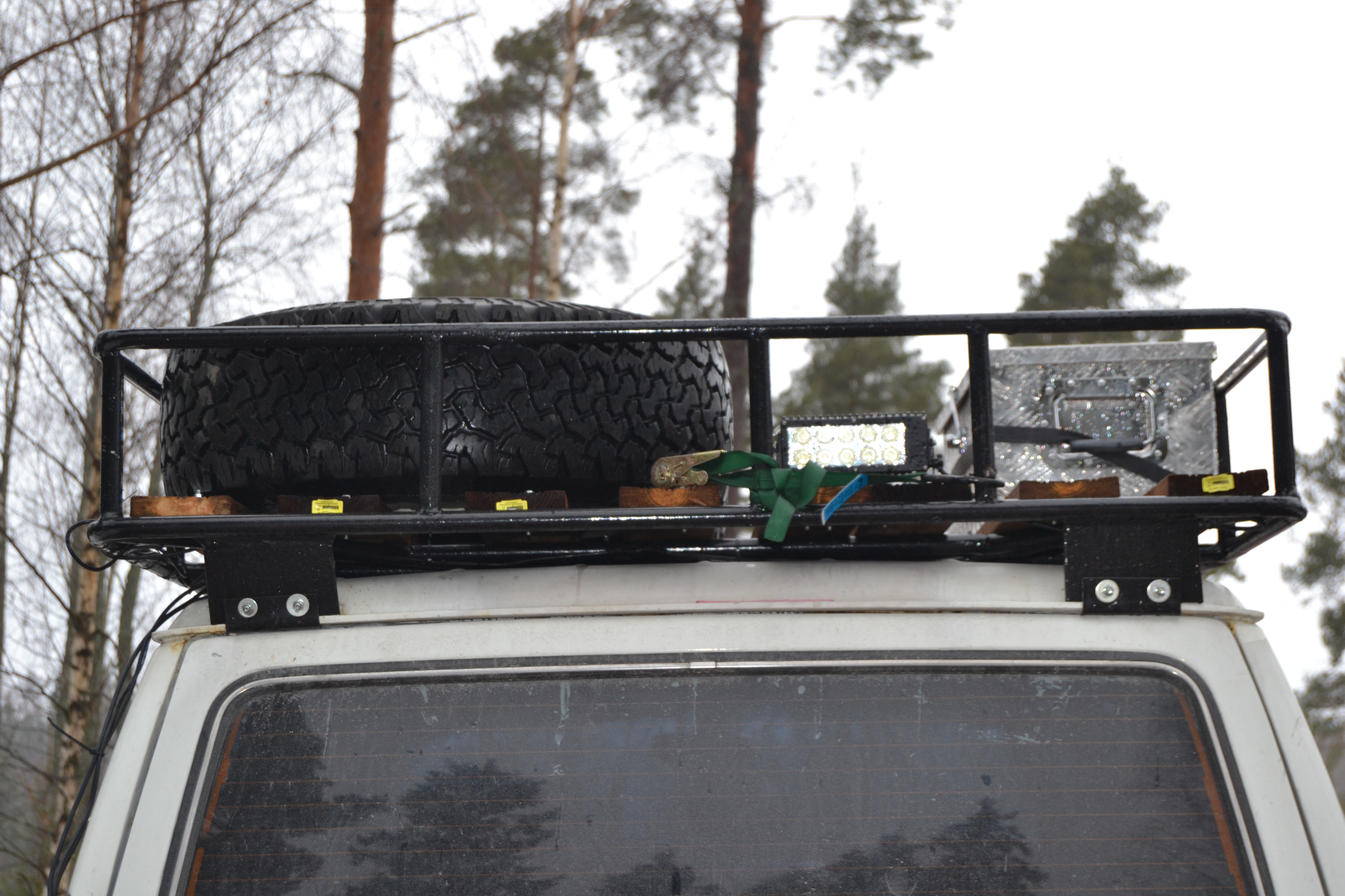 Tuollaisen askartelin, tuli vaan ujosti korkee, et välillä nojailee metsässä, kun on ahdasta ja auto vinossa. Etureuna näytti rumalta, niin lisäsin noi oksavaijerit, on muuten pirun kätevät, nyt on vaijereiden alapäässä trampoliinin jouset, ni pysyy "jännituksessä". Runko on 20x20 huonekaluputkea ja pohjalla "hissiverkko" 30x30 silmällä ja 3mm langalla, joka paikasta hitsattu kiinni ja tuntui kestävän kävellä, ainakin tallinlattialla. Lisään siihen vielä kolme per sivu lattaraudasta omat kiinnikkeet katosta pulteilla läpi, nyt on vaan kahdessa telineessä pulteilla läpikiinnitys... Ton koko on noin 120cmx220cmx20cm (lxpxk) etureuna on laitoja korkeempi, et mahtu vanhat valot... Päivityksiä joutuu muutenkin vielä terkemään, kiinnityspisteitä kaikille romuille rengas, tunkki, lapio... yms.