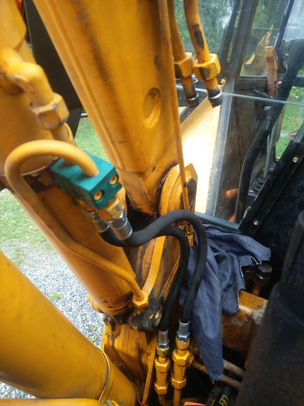 viimeksi jameksella työskentely jäi kesken pahan hydraliikka öljyvuodon vuoksi... Vuoto kohta löytyi ohjaamon alapuolelta lisähydrauliikan 6-tie venttilistä jonka ohjausvipu on kuljettajan penkin vieressä melkein alapuolella, josta ohjataan hydrauliikka kulmakaivuu laitteelle tai etukuormaajan lisähydrauliikalle. Olin epäillyt venttiilin vuotavan aijemmin vähäisesti, koska vaihdelaatikon päällä ohjaamon alla olevat syvennökset olivat öljyn peitossa muummoassa vaihteisto öljyn mittatikun ympärys oli öljyn peitossa ja james merkkasi paikkansa mihin jäi seisomaan. Venttiilin irroitus ei onnistunut kuin purkamalla ohjaamosta toiseltapuolen lattia auki... Valitettavasti penkin alapuolelta lattia ´´paneeli´´ ei irtoa, koska hitsattu ohjaamon rakenteisiin joten hauskuutta riitti kurotellessa venttiiliä sekä venttilin hydrauliputkia venttiilistä irti. Hydrauliputkia varten täytyi 30mm avolenkki avain lyhentää keskeltä poikki että pääsi hydrauliputket kääntämään venttilistä irti.