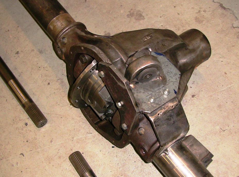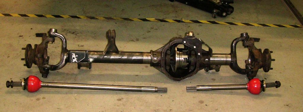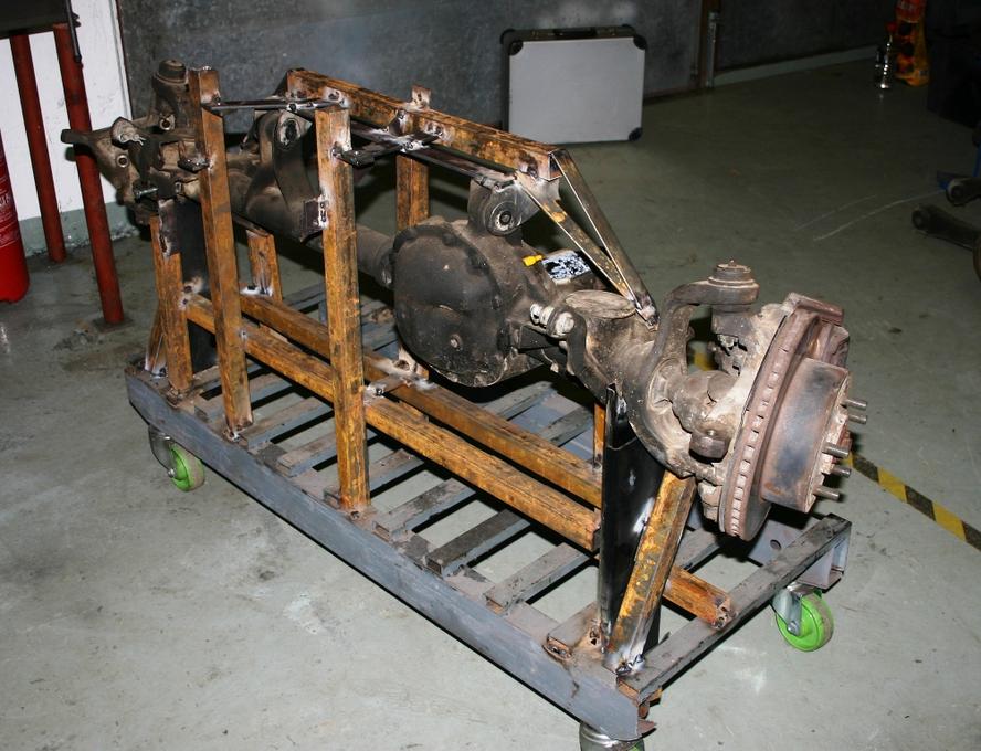 Akselia on koottu sen verran, että seuraavana ensimmäinen sovitus. Osat vasta hepattu kiinni. Murikan päällä oleva ylätukivarren kiinnitys on pultattava. Saa nähdä mahtuuko auton alle.