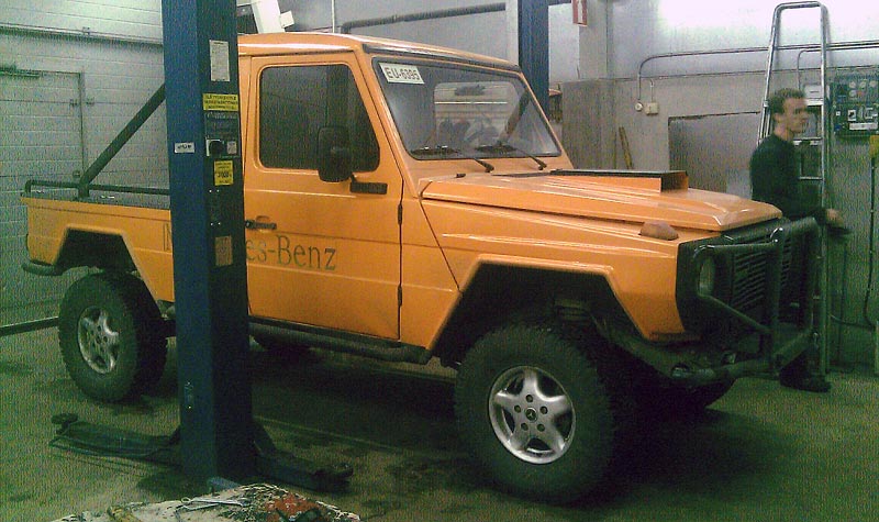 Gelandewagen 300GD+T flatbed -83 harrasteajoneuvoTapahtui edellisessä episodissa... Episodi I: Leimakuntoon Osa 1: pientä jarrujen herkistelyä leimalle Osa 2: jarrujen uudelleenrakennus Osa 3: pääsylinterin koston Osa 4: leima ja tuho Episodi II: Total failure Osa 1: kansiremontti Osa 2: moottoriremontti Osa 3: kone pois keulilta Episodi III: Feenikslintu Osa 1: Operaatio OM617 aka Operaatio Dumbo Drop Osa 2: Return of the Jedi Tulipa pitkään himoittua tälläkin palstalla rakenneltua oranssia G-mersua. Kun hinta ja sopiva rahoitus natsas kohdalleen, niin pakkohan se oli käydä hakemassa mersu uuteen kotiin, kun leimattavuus varmistui vaan ensin. Projektikuntoisena tuo auto myytiin ja pientä projektiahan siinä tosiaan on. Leimalle olis ainakin seuraavat laitettavat: Jarrujen täydellinen läpikäynti(putsaus/herkistely), todella oudon jarrujen pullataikinamaisuuden jos sais pois teräspunosletkuilla(tilattu punaiset Goodridget, 87e posteineen Englannista, kumiset motonetis 150e). Uudemman mallisen tehostimen jos löytäis jostain halvalla, niin vois olla ihan kiva kun poljinta ei tarvi painaa ku merihädässä. Uuden ohjausvarren(onko oikee nimitys simpukan ja navan välissä olevaan tankoon?) tekeminen FSJ:n nivelillä, kun nivelestä suojakumi paskana+nivel ottanu itteensä ja mersu viisaana tehnyt nivelistä tankoon kiinteät=uusi tanko 270e. Takaa pitäis panhard-tankoa lyhentää sen verran, että akseli keskittyy 3" korotusjousilla. Koneen säätäminen ja teholappujen penkitys. Todennäköisesti Schwitzerin S2BG turbo vaihtuu uudesta 220CDI:stä löytyvään kaksoisahdin hässäkkään, kun kaverilla olis semmoinen pikkuvikaisena tarjolla. Tehotavoite 200hv(aika maksimi vapari 617:lle) ja vääntökäppyrä mahdollisimman suora viiva heti tyhjäkäynniltä lähtien. En sano etteikö ton S2:sen tuoma turbopotku 3krpm jälkeen tois hymyä aina huulille, mutta jos tahtoisin vaparidieselin käytöksen normiajossa, niin ajaisin autolla jossa ei ole turboa... =) Alleajosuoja on hieman kysymysmerkki vielä. Tarkoitus olis muutostaa auto samalla N1G-luokkaan ja yrittää saada koijattua alleajosuoja auton käyttöä huomattavasti haittaavaks(esim kilpailukäyttö). Ei siinä että alleajosuoja pahemmin normikäyttöä haittais ja metässäkin sen sais parilla pultilla irti, mutta kun sattuu olemaan peruslaiskaa luonnetta, niin en millään jaksais semmosta väkertää... =) Lisäks kaikenlaista pientä laittoa. Esim takakilvelle tehdä paikka ja valaistus, taustapeilien jäykistäminen(etteivät vaihda asentoa ovea sulkiessa). Onneks tässä on vielä muutama kuukaus kesäkuun 13. päivään, kun alkaa katsastuskausi tuolla mesellä. Jos sitä vaikka sais kertalaakista pitkän leiman. Kunhan auto on leimassa, niin tarkoitus olis siirtyä tekemään autoon sisustaa. Sisusta tällä hetkellä hieman keskeneräinen. Tarkoituksena purkaa auringossa kulahtanut oranssi verhoilu pois. Kaikki kojelaudan ja ohjaamon muovit saavat pintaansa joko nukan(DIY kamat tilattu jenkeistä) tai keinonahan. Mittarin taustoissa olevat mustat turkkilevyt korvautuu aidolla hiilikuidulla(kaverilta löytyy sopivia jämäpaloja formulan valmistuksesta). Lattialle semmoinen paksu keinokuitumatto, takaseinään todennäköisesti kauitinhuopaa tai vastaavaa. Orggis kattoapahvia täytyy jatkaa et sopii pätkästyyn ohjaamoon ja paikkailla valo/yms reikien kohdalta. Sen jälkeen musta nukka pintaan. Penkkien kanssa olen vielä kahden vaihella, että verhoilenko tällä hetkellä käyttöbemmissä olevat halpis putkirunko kupit uudestaan vinyylillä/kunnon sisusaineilla ja laitan meseen vai ostanko jotkut vakiopenkit. Edelliskoppaisen V70:sen nahkapenkit olis kyllä erittäin mukavat, mutta pitäis löytää sellaiset vaan jostain kohtuu hintaan. Toinen vaihtoehto on ooppeleista löytyvät recaron penkit. Pitäis myös korjailla penkkien jalustaboksit, kun on näemmä ruostepirulainen päässyt jäytämään niitä lattianrajasta. Ei pysy luukut kiinni kun alalaita on vaan hävinnyt välistä. Sisustaan olis tarkoitus upottaa kymmeniä kiloja bitumia, alustamassaa, vaahtokumia ja vaimennushuopaa. Olen totaalisen kyllästynyt ajelemaan sisustottamalla autolla, kun käyttöbemmissä ei ole laisinkaan äänieristeitä ja sisustan muodostaa kuppipenkit ja 4-pistevyöt. Tiedän kyllä, että G on varsinainen traktori äänimaailmaltaan, mutta onhan niitä S-luokan traktoreitakin olemassa... =) Eli tavoitteena saada G:stä ainakin yhtä hiljainen kun W124 sedani. Kunhan saa autosta semmoisen että kuulee omat ajatuksensa 80km/h vauhdissa, niin sit voi asennella sopivat poppivehkeet. Subbari mahtuu just nätisti keskikonsolin jatkeeks(tosin siihen sais vaihtoehtoisesti jääkaapin... =) ja oviin ja kojelautaan saa upotettua kivasti 3-tie erkkasarjan. Hieman pyörinyt päässä ajatus DIN-paikkaan mahtuvasta näyttömankasta, jotta sais autoon peruutuskameran. Peileistä kyl pystyy peruuttamaan mukavasti, mutta perän ulottovuuden arviointi jää hieman puutteelliseks ja ei nää yhtään mitä perän takana on. Muita kulkupuoleen liittyviä pikkuprojekteja olis rengastuksen epätasapainon poistaminen. En tiedä onko vika mersun orginaaleissa 15" aluissa, noissa Allterrainissa vai siinä, ettei varsinkaan eturenkaita pysty tasapainottamaan järkevästi kun jarrusatulat rapsii painot veks ekan kerran ku rengas pyörähtää... Jos rahatilanne kesän aikana sattuis muuttumaan yllättävään suuntaan, niin kai se on pakko sijoittaa 15x10" peltivanteisiin ja 33x12,5" mudterraineihin. Eka käyn kyllä kokeilemassa miten tollaset 31x10,5" renkaat riittää Porvoon safarilla, ennen kuin annan mopon karata täysin käsistä... =) Etukardaanille pitäis kanssa saada tehtyä jotain, kun siitä taitaa tulla ajossa aika värinät. Liuku on joskus tehnyt lähempää tuttavuuttav kiven kanssa kanssa, joka on rikkonut liun stefan pesän ja itse stefan. Stefan paskouduttua on päässyt rasvat ulos ja paska tilalle. Tuloksena kardaani