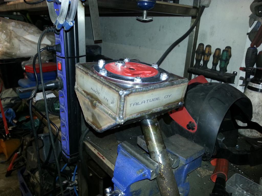 Eteenpäin. Ei ollut sopivaa putkea tankin korkin kaulukseksi, joten väkästelin latasta tollasen. Huohotinputkelle puuttuu vielä liitin. Tulee tohon isomman putken kylkeen.