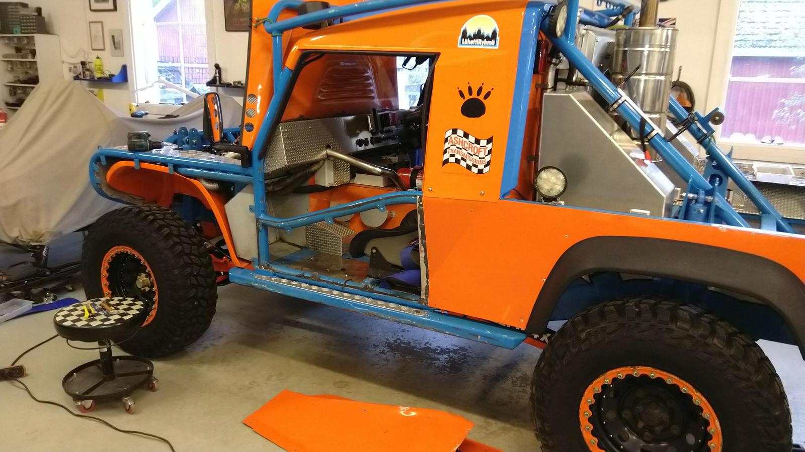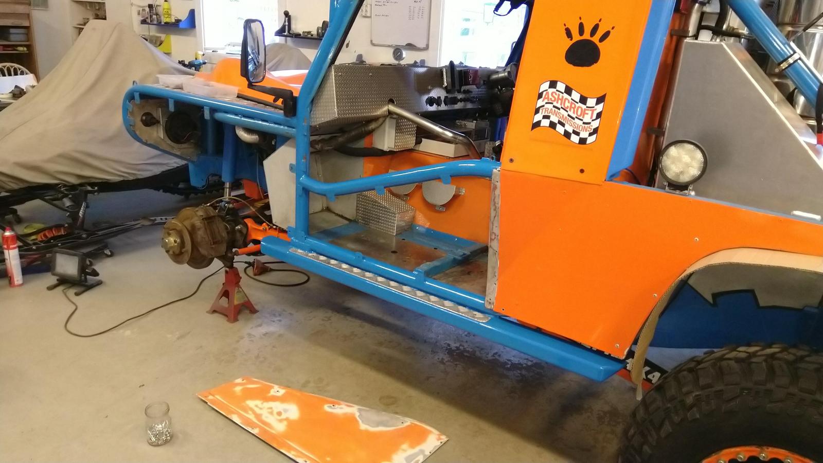 Hankin tuollaisen säädettävän panhardin, saa ton akselin keskelle kun on siirtynyt jousituksen noston seurauksena sivuun. Pitihän se sit sutasta teeman mukaiseen väriin, samalla kun nuo sisälokasuojatkin