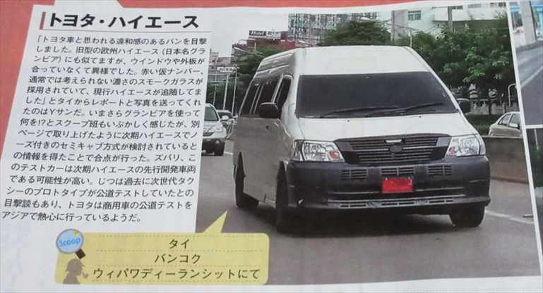 Kuvan auto näyttää viimeiseltä Euroopan Hiacelta. (keulasta paikallinen vanha Granvia/Grand Hiace vm 2000-2003) Ja on todennäkösesti siis naamioitu testiauto, aika näyttää... |
