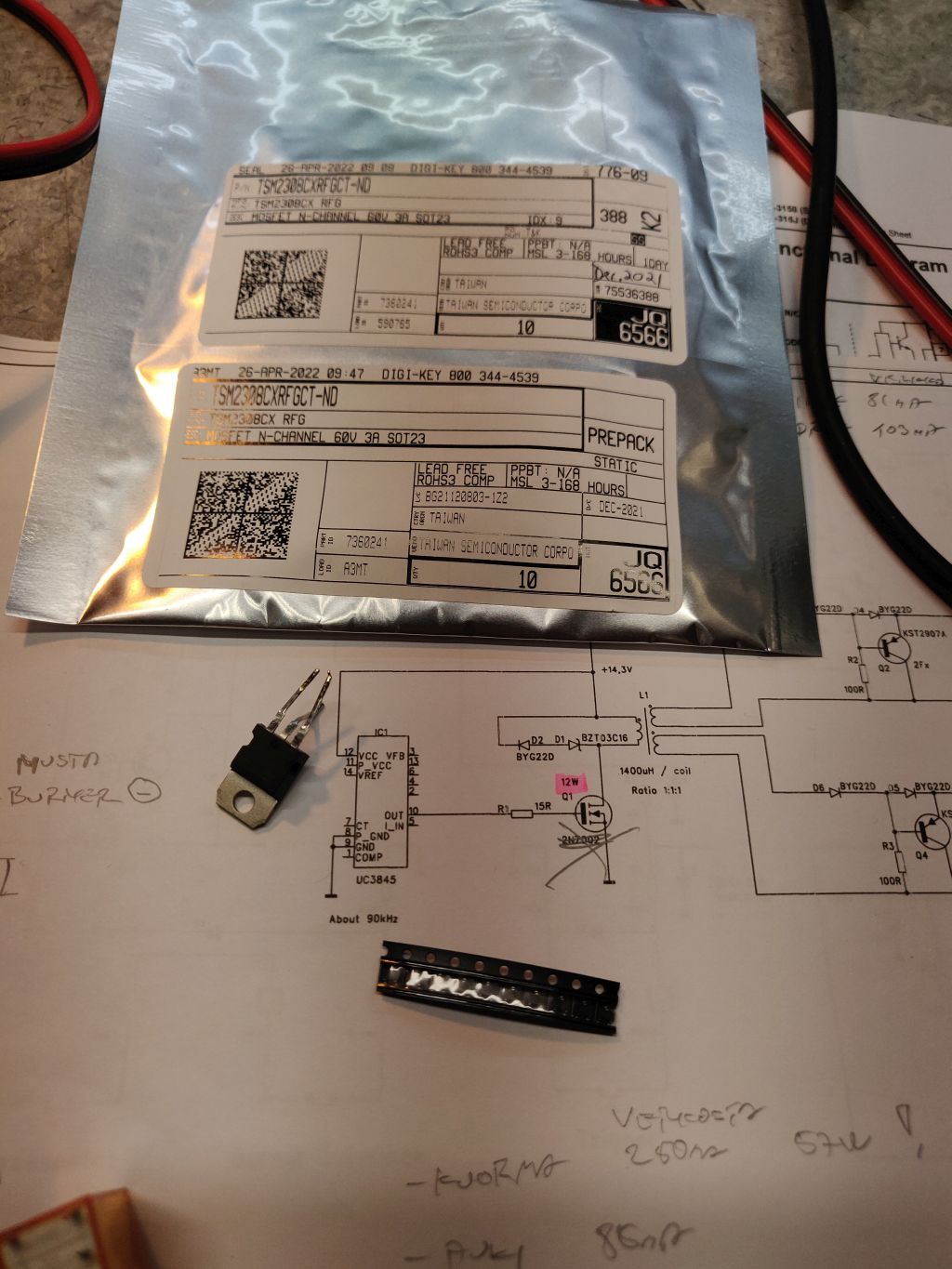 Sitten oli vielä ohjelmassa IGBT gate driverin fetin vaihto. Alkuperäinen SOT23 kotelossa oleva jäi varmuudella tunnistamatta. Kotelossa kun lukee vaan 12W. Tällä reverse dekoodaus antaa 2N7002 tyypin mikä on ihan liian heikko spekseiltään tähän paikkaan. Testeissä ollut isompi TO220 kotelossa oleva korvaamassa tuntematonta jotta päästy eteenpäin. Osia tilatessa katselin suunnittelijan silmin soveltuvia vaihtoehtoja mitä tuossa SOT23 kotelossa saisi. Kärkeen valikoitui TSM2308 fetti. 60V 3A ja Vgs +/- 20V. Tämä Vgs (Gate-Source) jännitekesto on ongelmallinen speksi näissä pikku feteissä. Tässä tapauksessa kun UC3845 kontrollerilta tulee noin 14.5V ohjaus niin Vgs pitää olla enemmän kuin tuo 14.5V. Vähän driverin rasituskokeita. Hyvin tuntui pysyvän sauhut sisällä. |