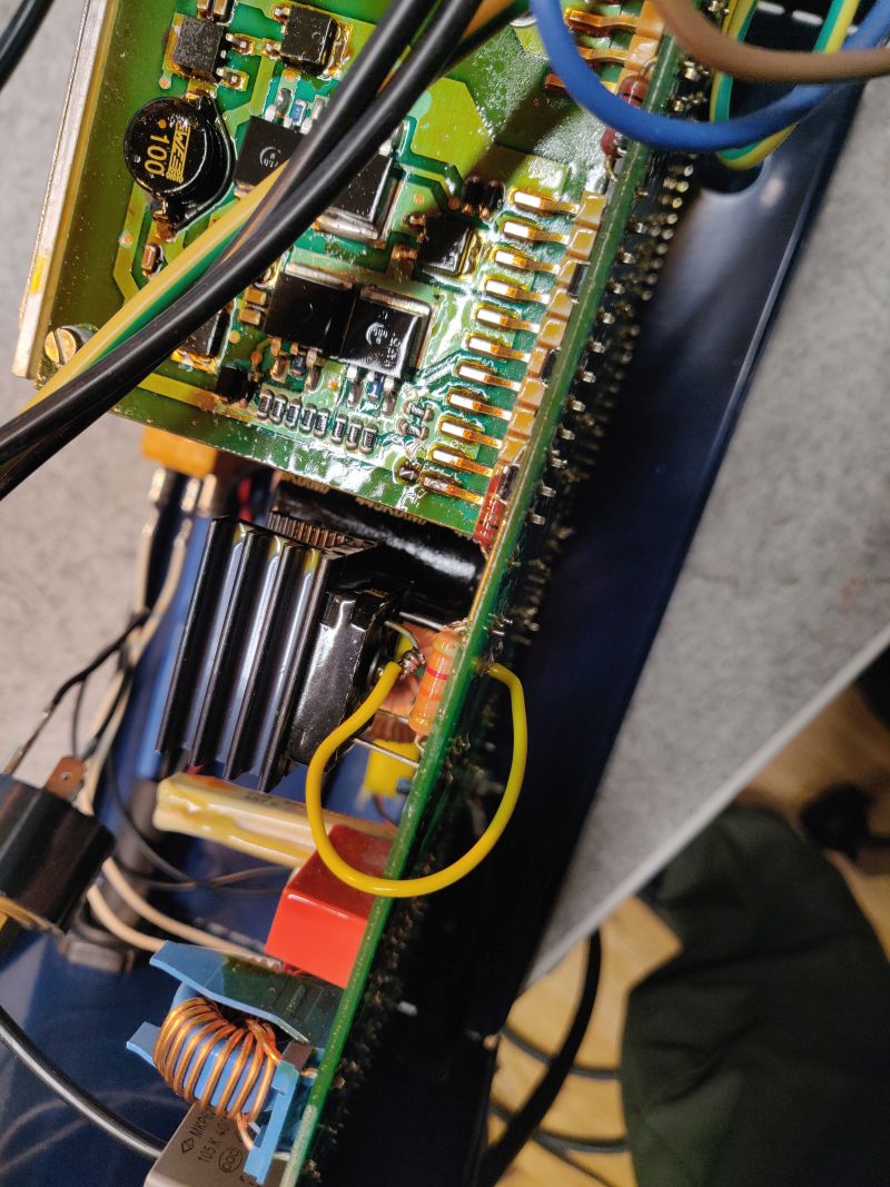 Sitten mekaniikkahommia. IGBT kortin jäähdytydripa oli alun perin liimattu alumiinipiirilevyyn. Päädyin kitenkin poraamaan korttiin kolme reikää ja kiinnittämään jäähdytyslevyn ruuveilla. Piitahnaa väliin. Lakkaa päälle jos vaikka estäisi ryömintä/pinta päpilyöntejä. Pelkästään IGBT trankkujen C-G jalkojen väli on pelottavan pieni vain millin luokkaa. Aikaisemmin kun kyseltiin mistä hajonnut, niin läpilyönti on voinut tapahtua tässäkin. Yhdessä räjähtäneessä trankussa oli selvästi palanut valokaari C-G välillä. Vielä kortti lootaan ja johdot kiinni. |