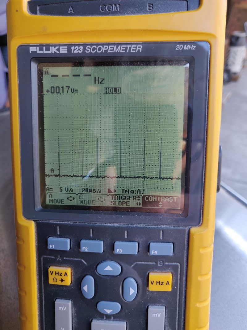 Kaunis ilma ja ukkokin hereillä niin ei muuta kuin La Poratoorio ulos ja mittaamaan. Konvertterin asetusarvo, startti- ja poltto pulssisuhteet näyttivät järkeviltä. Ei vaan syty joka laukauksella. Nyt havainto alkoi olla selvä. Virta nousee, mutta ilmaventtiili ei aukea. Avaus pulssin muotoa ei saanut mitattua ulkona, mutta pitojännite näytti vaatimattomalta. 3.6V 24V solenoidille. Oheishavaintona ilmeni sellainen ominaisuus, että starttivirran ollessa olemassa logiikka yrittää käynnistystä noin 4s sekvenssillä. 3s yritys ja 1s taukoa. Labrapöydällä kun pääpiiri on virrattomana yrittää koko ajan eli odottaa, että saisi virran nousemaan. |