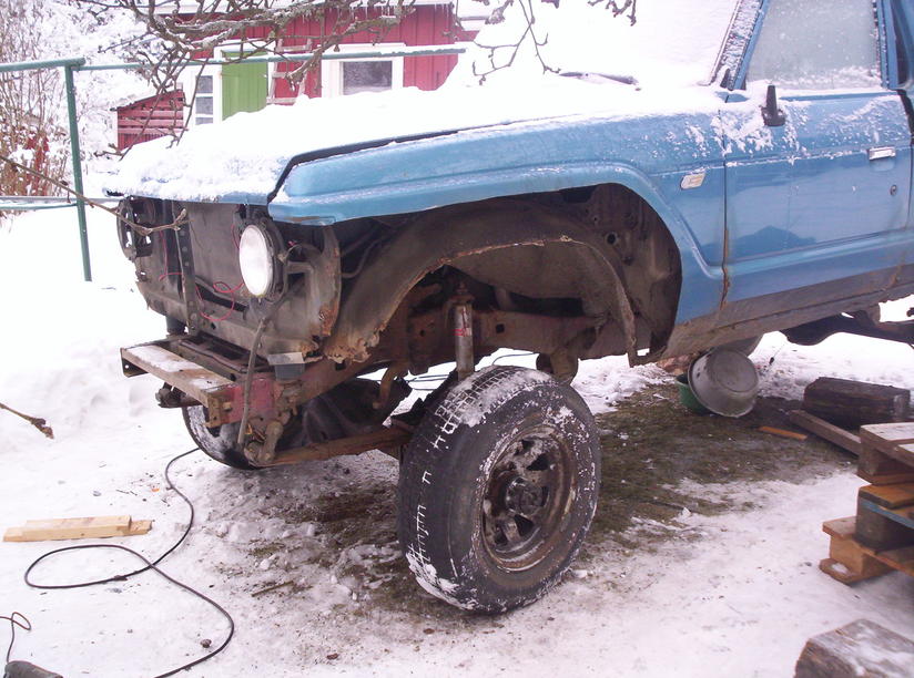 No nyt on etuakseli paikallas. Aika paljon se nousee ku tekee SOA:n. Viel ku sais kunnon renkaat ni ois hjuva. Seuraavaks tarttis väännellä ja käännellä ohjaus kilkkeet paikallesa.