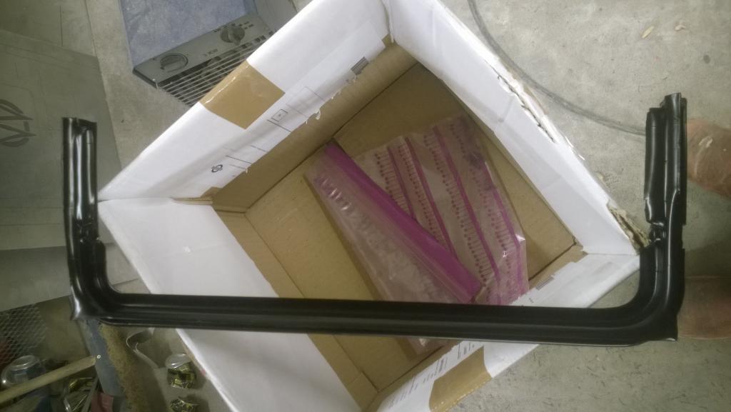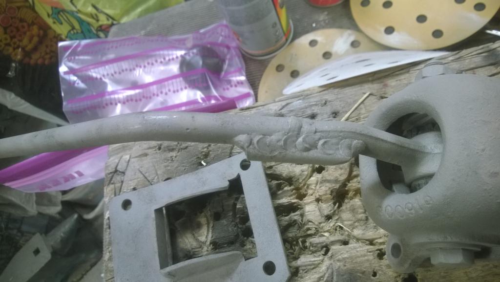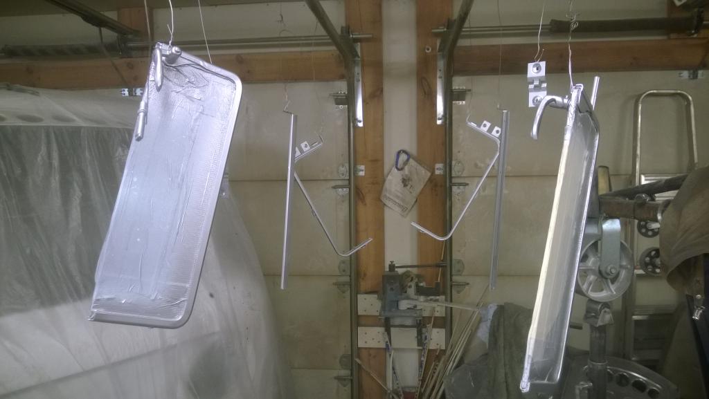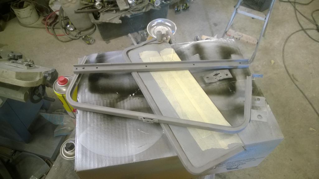 Hiekka puree kromiin hyvin, mutta eiehkä ruosteeseen ihan niin rajusti kuin silikaatti. Muutama minuutti per osa: Ja sitten pohjamaalia pintaan. Jos nyt iltasin sais eri pisteosia puhallettua puhtaaks ja maaliin niin sitten kun koriin saa pintavärin pääsee kasailee noita suoraan paikoilleen. |