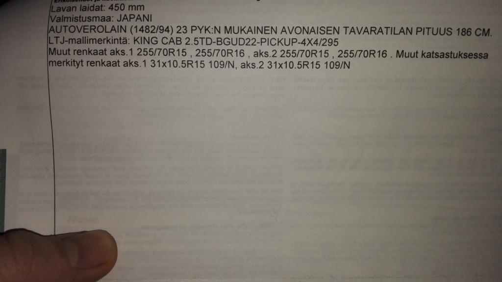 ^ "Vaihtoehtoiset renkaat" on alkuperäinen rengaskoko, "vaihtoehtoinen rengaskoko" ei. En tiijä mikä äly oli aikoinaan jättää nykymallin otteelta tuosta jälkimmäisestä "katsastuksessa merkitty"-alkuosa pois.