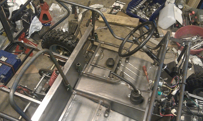 ![]() Lattia vihdoin valmis. Ei ihan esikuvan mukainen, mutta ketjulinjat näytteli pääosaa hommassa. Hitto mitä hieromista ja taas olis tarvinnut kaikenmailman pellintyöstökoneita... ![]() Esim. kanttikonetta. Hoksasin lopulta tehdä sikki-koneella uran taite kohtaan niin pitempikin pokkaus onnistui kohtalaisesti viilapenkissä kulmarautojen kanssa. ![]() "Kardaanitunneli" on irroitettava, että pääsee tarvittaessa ropaamaan ketjulinjoja. Ketjujen kiristys onnistuu myös altapäin. |