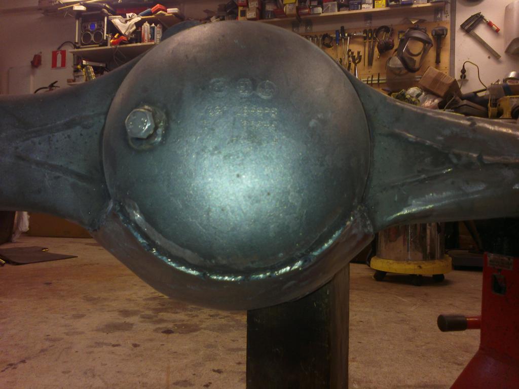 eli mutteri hitsattu sopivaan reikään ja pultti katkottu sopivan mittaseks + kupariprikka tiivisteeks: Sitten nappasin vanhasta peränkuoresta propun uusiokäyttöön, samoten G mersun takapanhardin toisen pään, porasin perän alapuolelle reiän ja hitsasin kahtapuolta 'putken' banjoon ja vanha proppu sen sisälle suojaan. Nyt ois taas tyhjennysproppukin mistä saa ainakin enimmät peräöljyt ulos. Saumasta tuli kyllä paljon tasasempi kuin mitä kuva näyttää ja hitsattu molemmin puolin joten luulis että pitää... Viimisenä tuli tekastua tuosta takaperän pinionin laipasta ns. double drilled version eli nyt siitä löytyy oikea jako myös tuolle sovitinlaipalle.Ens viikolla jos kävis vaihtamassa migin pullon täyteen niin vois hitsata tuon putkipäädyn paikoilleen ja pääsis miettimään alapuolen panssaria/materiaalin lisäystä että kestää hieroa eikä mee puhki ihan heti... Viimeksi muokannut mparty : 20.04.2013 18:21 |